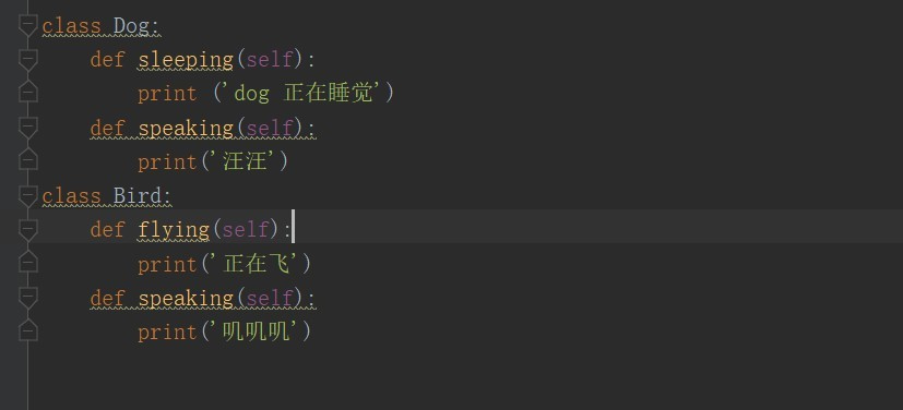 一个dog类,一个bird类class Dog: def sleeping(self): print ('dog 正在睡觉') def speaking(self): print('汪汪')class Bird: def flying(self): print('正在飞') def speaking(self): print('叽叽叽')