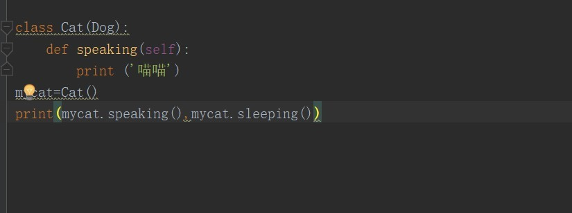 class Cat(Dog): def speaking(self): print ('喵喵')mycat=Cat()print(mycat.speaking(),mycat.sleeping())