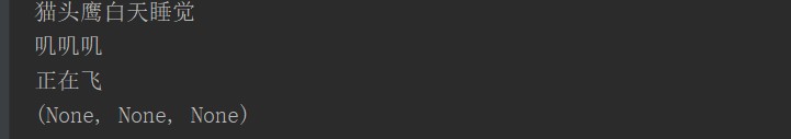 class MaoTouYing(Bird): def sleeping(self): print('猫头鹰白天睡觉maotouying =MaoTouYing()print(maotouying.sleeping(),maotouying.speaking(),maotouying.flying())