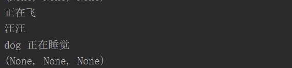 class FlyCat(Dog,Bird): passflycat=FlyCat()print(flycat.flying(),flycat.speaking(),flycat.sleeping())