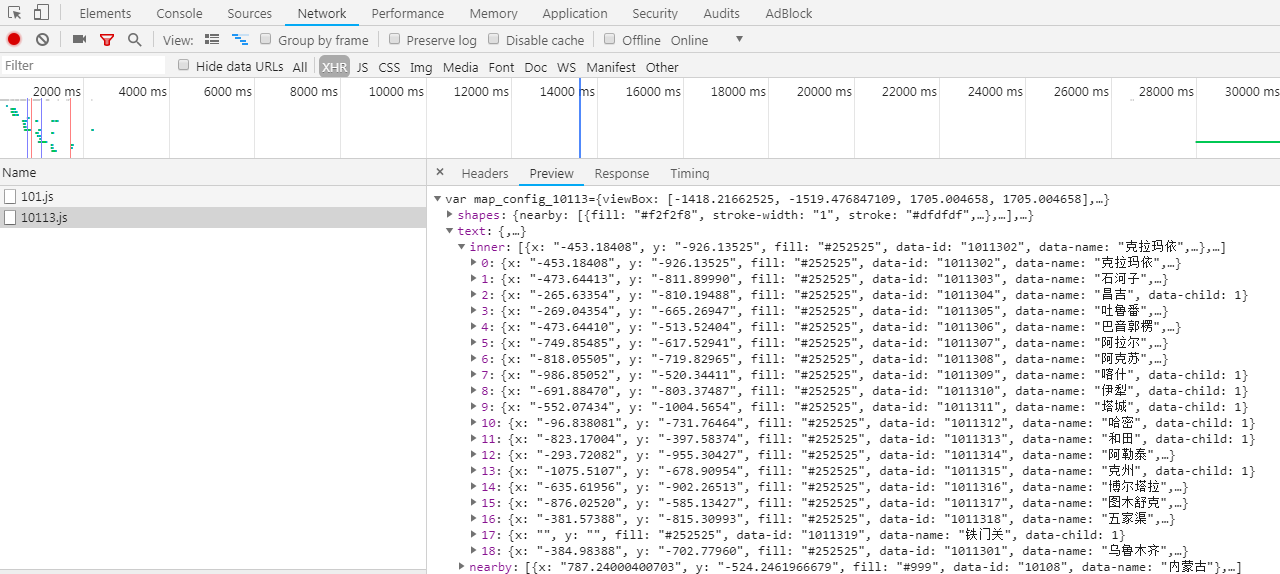打开开发者工具,点击XHR选项,可以发现有如下内容,而这些数据里就包含着我们需要的编码信息: