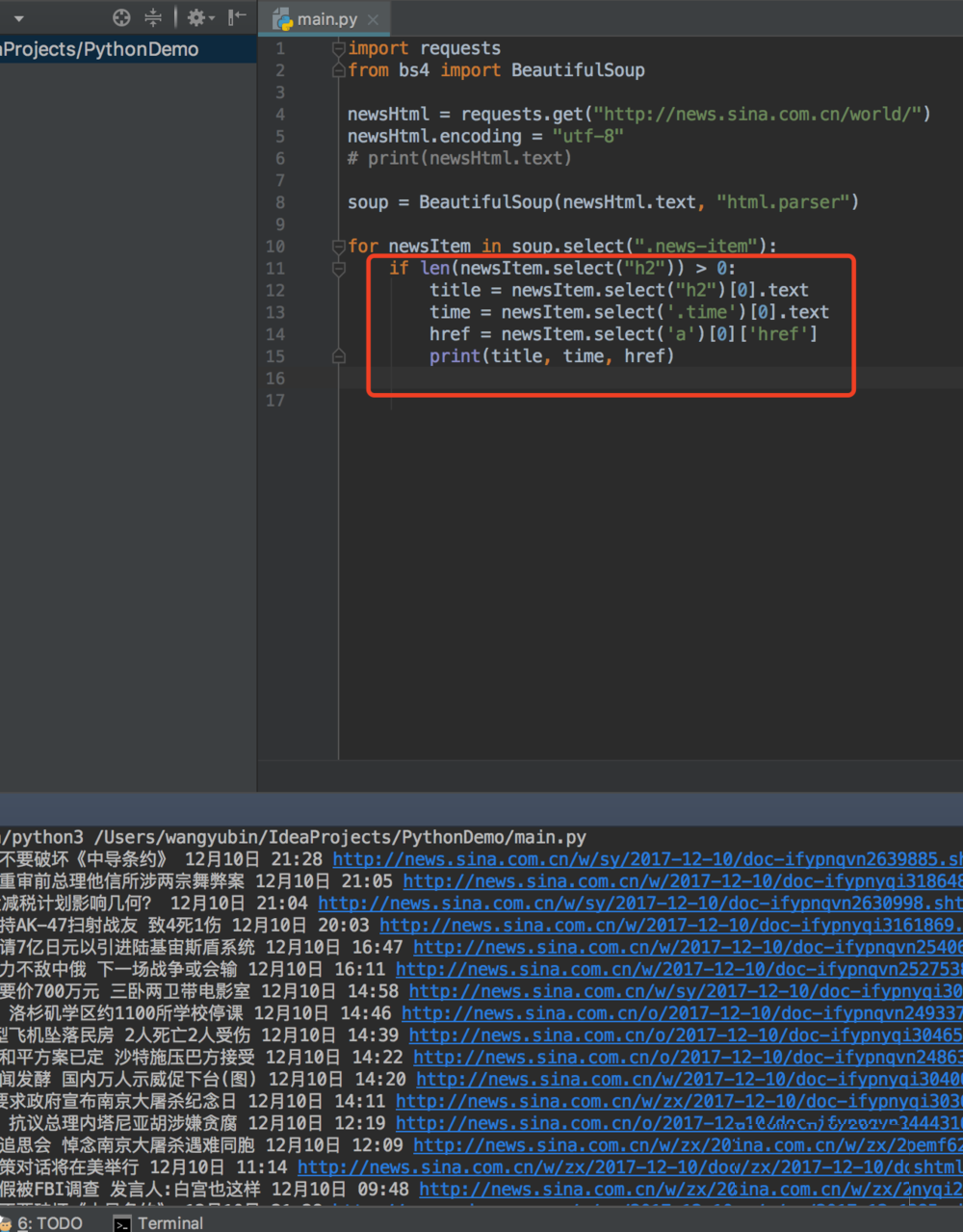 9、然后我们编写标题时间地址的python程序,就可以爬取出对应的标题内容,时间和地址