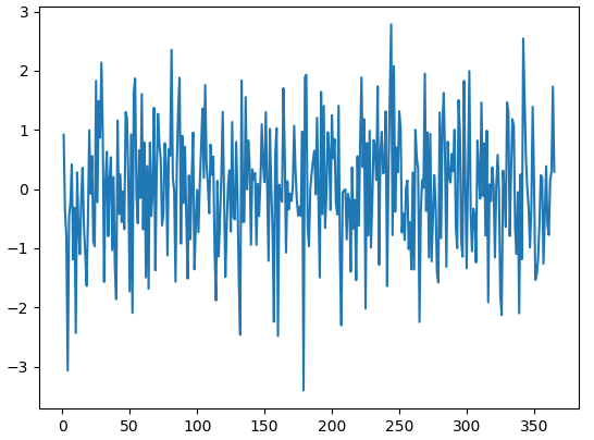 import pandas as pd import numpy as np import matplotlib.pyplot as plt ts = pd.Series(np.random.randn(365), index=np.arange(1,366)) ts.plot() plt.show()