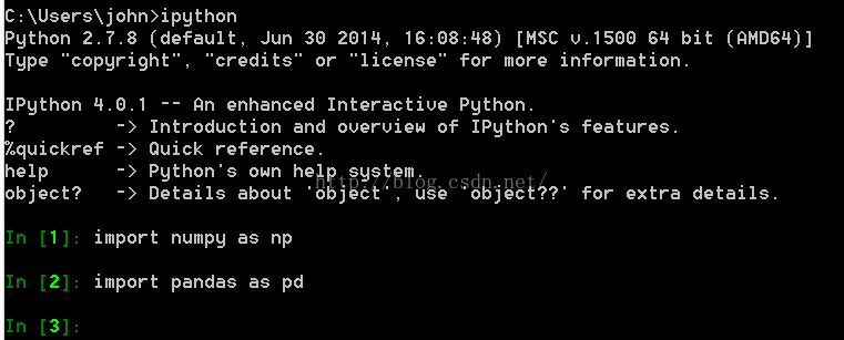 2.在网址:http://www.microsoft.com/en-us/download/details.aspx?id=44266 直接下载 Microsoft Visual C++ Compiler for python2.7安装即可。注意:在安装pandas的过程中可能会等待很长一段时间,大家耐心等待即可。千万不要以为是安装过程出现了错误,去卸载numpy之类的。等待7,8分钟之后就会提示pandas安装成功,此时可以成功的导入pandas库: