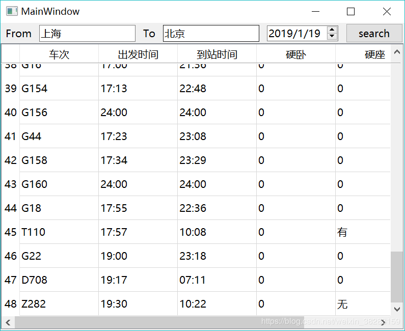 3、槽函数(event.search)调用爬虫类(TrainService)获取车次信息,添加到QTableWidget对象中。