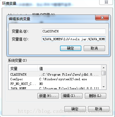 再新建一个变量名CLASSPATH的环境变量,变量值为:%JAVA_HOME%\lib\tools.jar;%JAVA_HOME%\lib\dt.jar