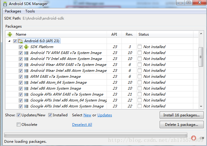 双击打开SDK Manage.exe,选择需要安装的API版本和对应的工具包进行安装,这些在运行模拟器和真机测试的时候会使用到
