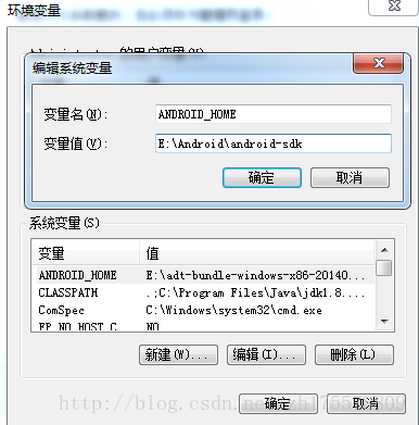 在Path变量中增加两个路径:E:\Android\android-sdk\platform-tools和E:\Android\android-sdk\tools