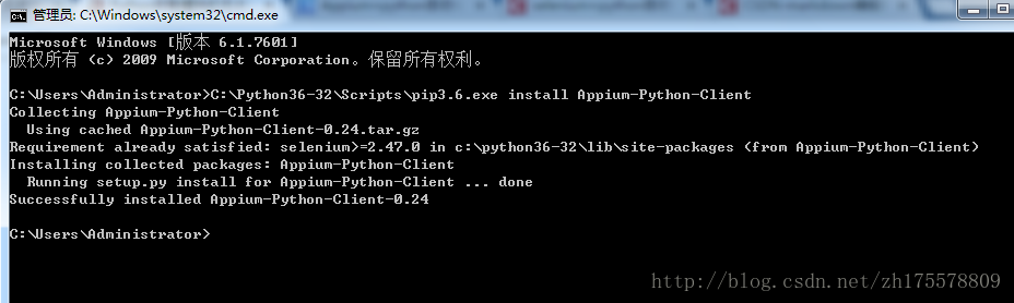 上面已经安装了python,也可以通过python的pip命令直接安装,在命令行中运行pip install Appium-Python-Client