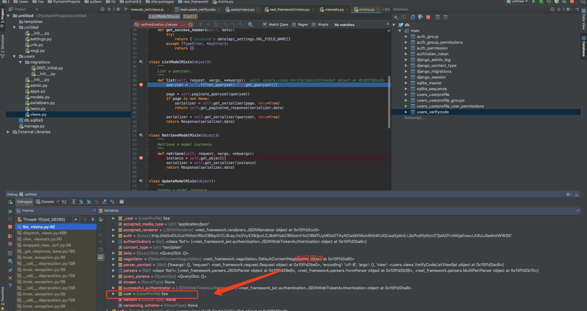 查看request 中的user可以看到用户代表成功request.auth 可以获得token