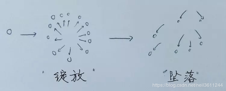 设计理念:通过让画面上一个粒子分裂为X数量的粒子来模拟爆炸效果。粒子会发生“膨胀”,意思是它们会以恒速移动且相互之间的角度相等。这样就能让我们以一个向外膨胀的圆圈形式模拟出烟花绽放的画面。经过一定时间后,粒子会进入“自由落体”阶段,也就是由于重力因素它们开始坠落到地面,仿若绽放后熄灭的烟花。