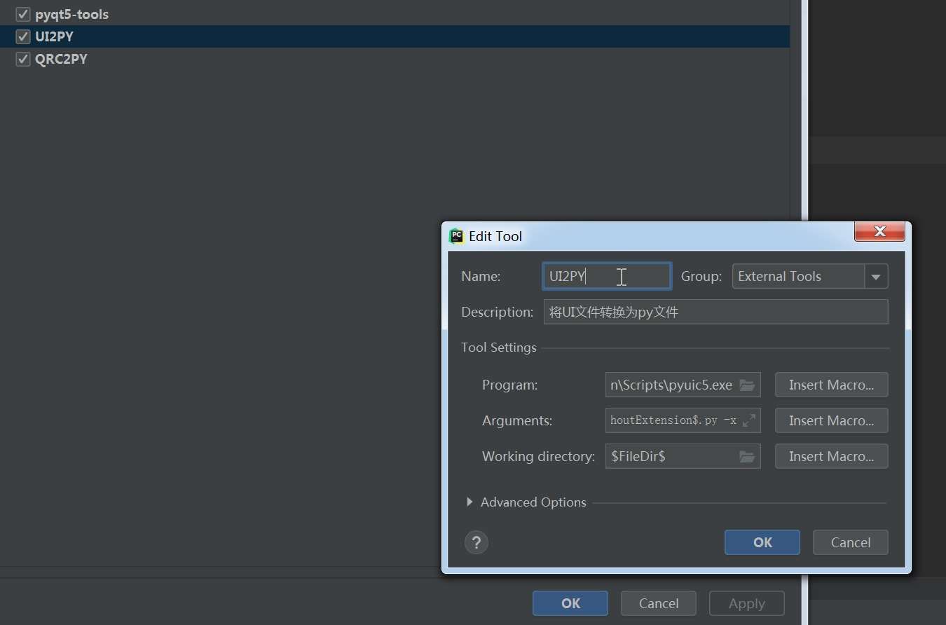 2.Arguments配置为$FileName$ -o $FileNameWithoutExtension$.py -x