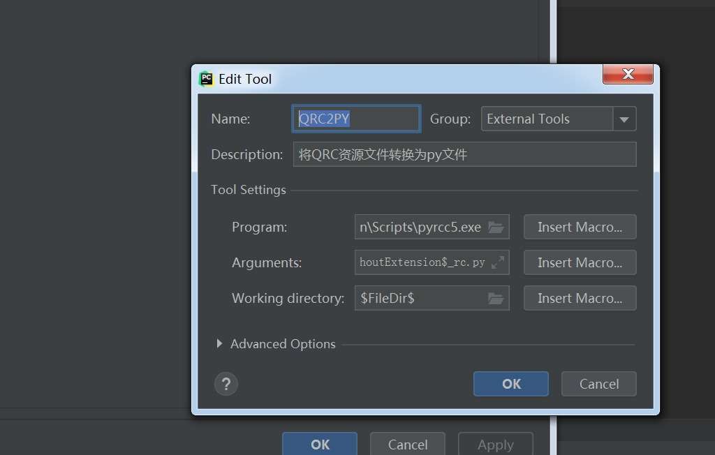 2.Arguments配置为$FileName$ -o $FileNameWithoutExtension$_rc.py