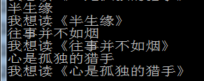 books=['半生缘','往事并不如烟','心是孤独的猎手'] for book in books: print(book)