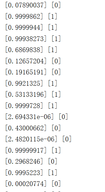 其中n为y的种类,在上面的例子中需要包含0和1的y_*log(y)(y_表示真实类别,y表示预测类别),而上面的例子中只包含了一个y_*log(y),在上例中正确的损失函数定义应该为loss = y_*log(y) + (1-y_) * log(1-y)。为了便于大家理解,我引用al_kk:“如果只有一个类别的交叉熵即y_ * log(y),如果真实类别y_为0,那么无论预测值y为任何值的时候,损失函数始终为0”。除此之外,大家可以想一下,当预测值始终为1的时候,那么损失函数是不是就会一直为0,这也是为什么输出预测值y的时候,y的值都是大于1的。如果将y的shape改为[2]的话,就可以使用y_*log(y)。