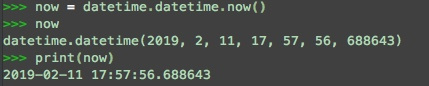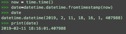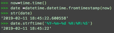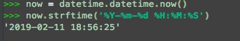 now='2019-02-11 18:45:22' date=datetime.datetime.strptime(now, '%Y-%m-%d %H:%M:%S')