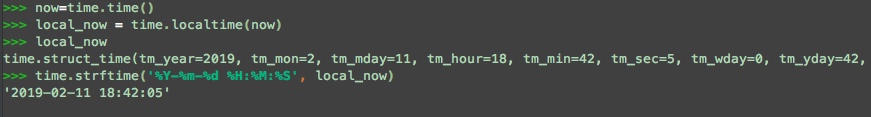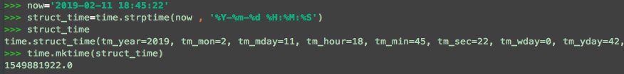 now='2019-02-11 18:45:22' struct_time=time.strptime(now , '%Y-%m-%d %H:%M:%S') timestamp=time.mktime(struct_time)