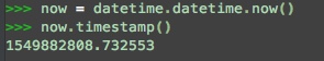 now = datetime.datetime.now() # 转换为 struct_time 对象 t=now.timetuple() # struct_time 输出时间戳 timestamp=time.mktime(t)