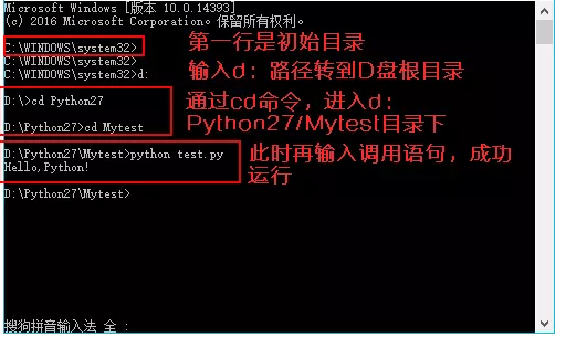 注意:如果当前盘符不是 D 盘,需要先转到 D 盘,输入 d: 回车即可。然后才可以使用 cd d:/Python27/Mytest
