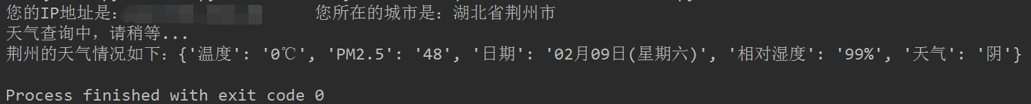 之前写过一篇用Python发送天气预报邮件的博客,但是因为要手动输入城市名称,还要打开邮箱才能知道天气情况,这也太麻烦了。于是乎,有了这一篇博客,这次我要做的就是用Python获取本机IP地址,并根据这个IP地址获取物理位置也就是我所在的城市名称,然后用之前的办法实现查询天气,再利用百度语音得到天气预报的MP3文件,最后播放,这样是不是就很方(tou)便(lan)了呢?