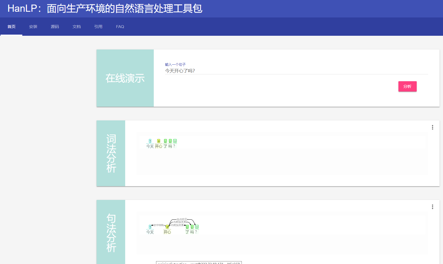 登录http://localhost:8765就能看下可视化界面,能看到分词结果和依存关系的结果,是不是很直观。这个网页上还有安装说明、源码链接、文档链接、常见的问题(FAQ)。