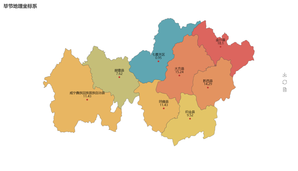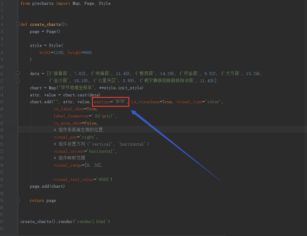 from pyecharts import Map, Page, Styledef create_charts(): page = Page() style = Style( width=1100, height=600 ) data = [('赫章县', 7.62), ('纳雍县', 11.43), ('黔西县', 14.29), ('织金县', 9.52), ('大方县', 15.24), ('金沙县', 18.10), ('七星关区', 0.95), ('威宁彝族回族苗族自治县', 11.43)] chart = Map("毕节地理坐标系", **style.init_style) attr, value = chart.cast(data) chart.add("", attr, value, maptype='毕节', is_visualmap=True, visual_type='color', is_label_show=True, label_formatter='{b}\n{c}', is_area_show=False, # 组件条距离左侧的位置 visual_pos='right', # 组件放置方向('vertical', 'horizontal') visual_orient='horizontal', # 组件映射范围 visual_range=[0, 20], visual_text_color='#000') page.add(chart) return pagecreate_charts().render('render2.html') #如果想保存到指定路径:create_charts().render('C:\\Users\\SYH\\Desktop\\render2.html')