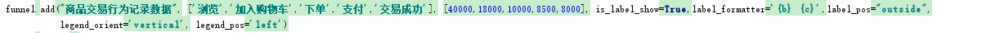 funnel.add("商品交易行为记录数据", ['浏览','加入购物车','下单','支付','交易成功'], [40000,18000,10000,8500,8000], is_label_show=True,label_formatter='{b} {c}',label_pos="outside",legend_orient='vertical', legend_pos='left')