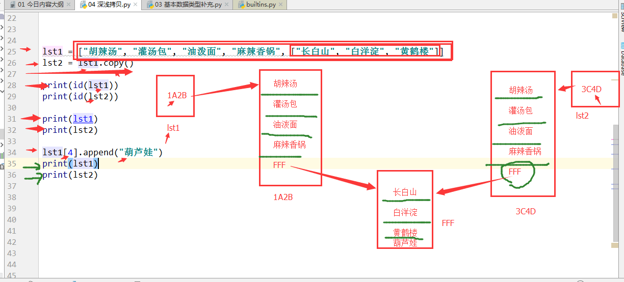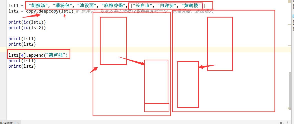 print(lst2)#['胡辣汤', '灌汤包', '油泼面', '麻辣香锅', ['长白山', '白洋淀', '黄鹤楼']]