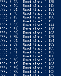 效果如下,可以看到使用 numpy 的 reshape 方法后,处理用时大幅减少,帧率可以达到 8~9 帧。然而经过优化后的处理速度仍然是比较慢的: