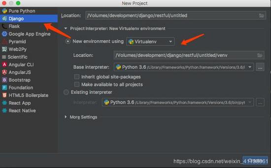 首先使用Pycharm新建一个Django项目,并且使用virtualenv或者pipenv虚拟环境