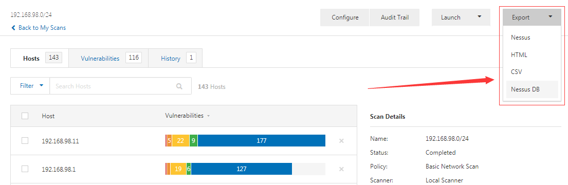 登录后通过New Scan创建扫描任务,扫描完成后,我们即可导出扫描报告。Nessus提供4种报告类型导出: