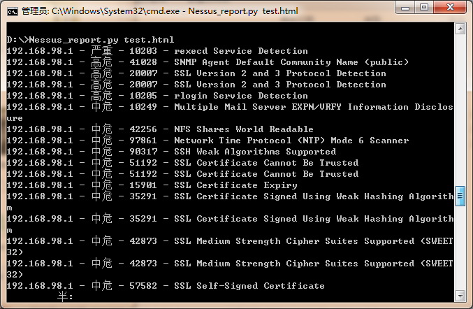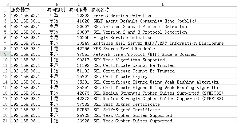 本文提供了一个demo,用于半自动化生成Nessus报告,有需要的话,可入库扩展,增加自动翻译,提供修复建议等。Nessus中文漏洞库可参见这个项目,NessusReportInChinese:半自动化将 Nessus 英文报告(csv格式)生成中文 excel ,中文漏洞库已有700多条常见漏洞。