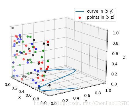 # and the (x,y) points are plotted on the x and z axes.
