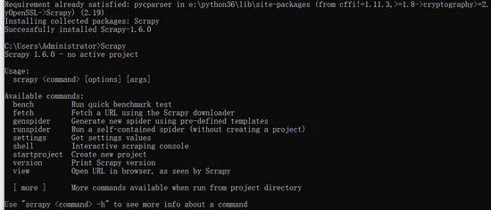 安装后在命令行输入Scrapy,见到如下提示说明安装成功了!