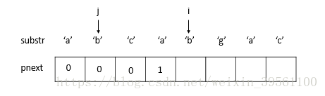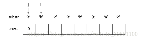 1) 由于substr[j] != substr[i] 并且j=0, 令pnext[i] = 0 , i往后移一位。(步骤1后,j=0, i=2)