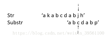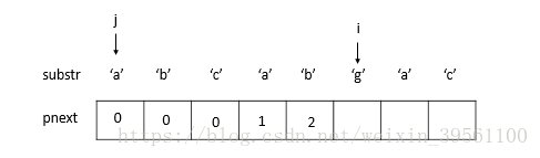 <3> str[i] != substr[j], 此时j != 0, 所以临时数组pnext就派上用场了。令 j = pnext[j-1]. (i=2, j = pnext[2-1] = 0)