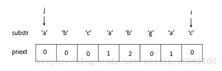 9) substr[j] != substr[i], 且j=0, 令pnext[i] = 0。(此时i到达最后一个位置,并且pnext数组全部赋值完毕。pnext数组构造结束)