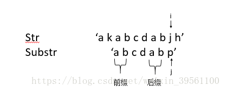如果存在前后缀的话(即pnext[j-1]!=0),由于此步骤之前的substr与str相同(要不然 j 也不会往后移动了),这里举一个例子帮助理解: