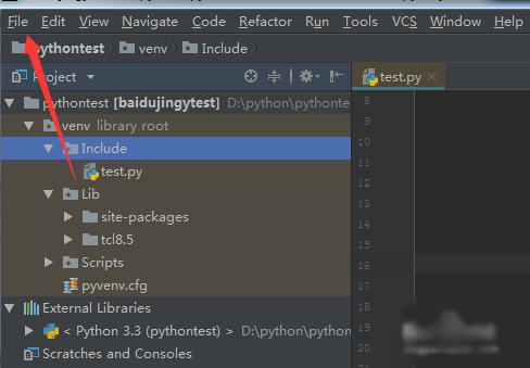 首先,进行打开一个pycharm的软件的界面当中,进行点击菜单中的 file 的选项菜单。