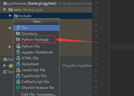 这样进行点击new之后,弹出了下一级菜单选中为 python package 的选项。