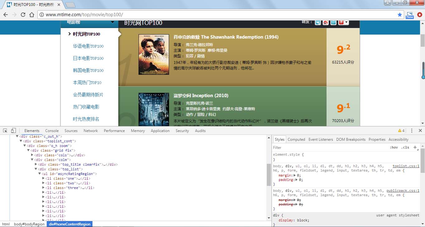 本次我们爬取时光网(http://www.mtime.com/top/movie/top100/)上的电影排名,该网站网页结构较简单,爬取方便。