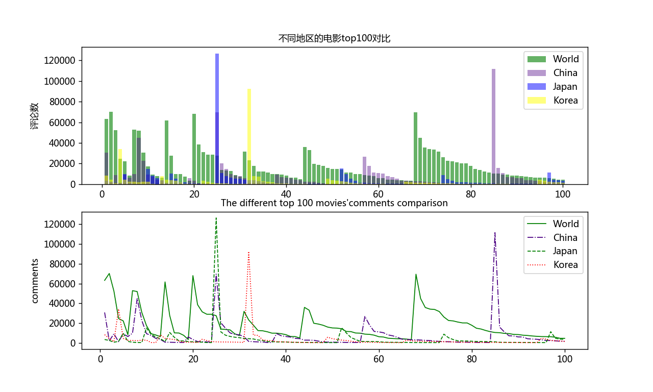 2. 将爬取数据保存为csv格式后,取出并使用matplotlib绘图库分析对比评论人数一项