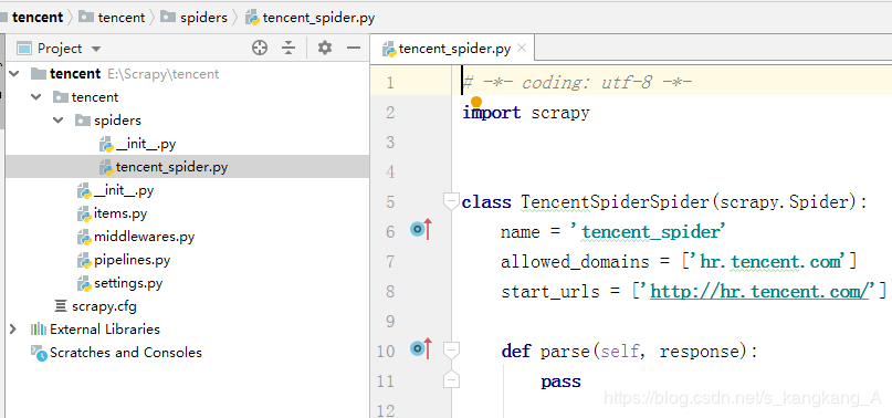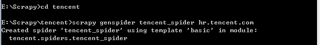 三:进入项目新建一个爬虫:scrapy genspider tencent_spider hr.tencent.com