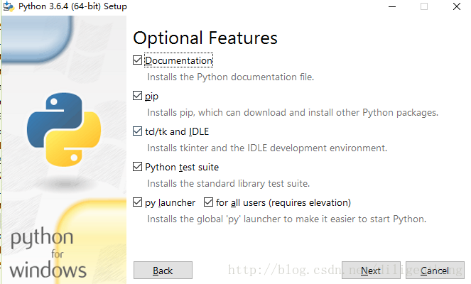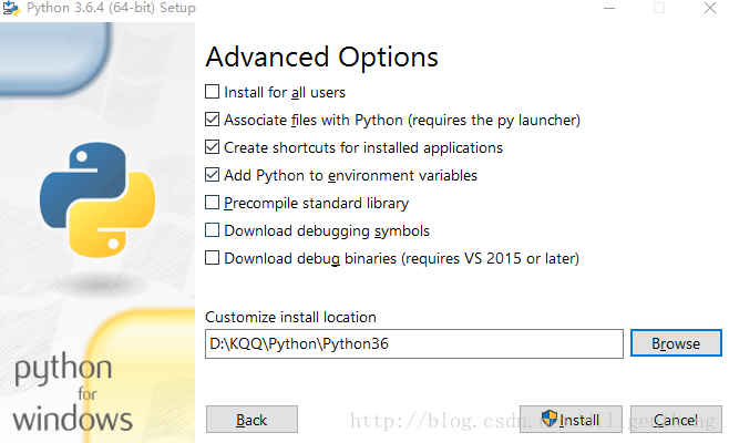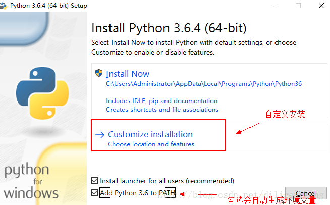 2.下载完成后双击.exe文件进行安装,可以自定义安装,也可以默认安装,我选择的是自定义安装,注意:我这里是选择自动生成环境变量,所以我把Add Python3.6 to Path勾选上了。
