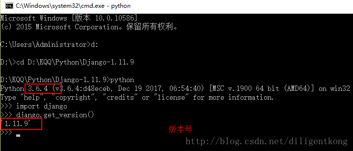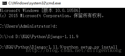 将其解压并和Python安装目录放在同一个根目录中,我的Python3.6.4是安装在 D:\KQQ\Python\Python36中,所以django是安装在D:\KQQ\Python\文件夹下, 进入Django目录,(我的是D:\KQQ\Python\Django-1.11.9 这个文件夹下),执行