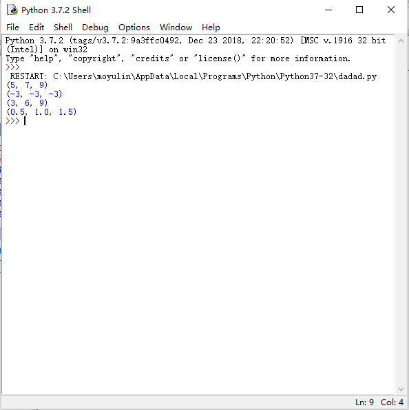 class Vecter3: def __init__(self, x=0, y=0, z=0): self.X = x self.Y = y self.Z = z def __add__(self, n): r = Vecter3() r.X = self.X + n.X r.Y = self.Y + n.Y r.Z = self.Z + n.Z return r def __sub__(self, n): r = Vecter3() r.X = self.X - n.X r.Y = self.Y - n.Y r.Z = self.Z - n.Z return r def __mul__(self, n): r = Vecter3() r.X = self.X * n r.Y = self.Y * n r.Z = self.Z * n return r def __truediv__(self, n): r = Vecter3() r.X = self.X / n r.Y = self.Y / n r.Z = self.Z / n return r def __floordiv__(self, n): r = Vecter3() r.X = self.X // n r.Y = self.Y // n r.Z = self.Z // n return r def show(self): print((self.X,self.Y,self.Z)) v1 = Vecter3(1,2,3) v2 = Vecter3(4,5,6) v3 = v1+v2 v3.show() v4 = v1-v2 v4.show() v5 = v1*3 v5.show() v6 = v1/2 v6.show()