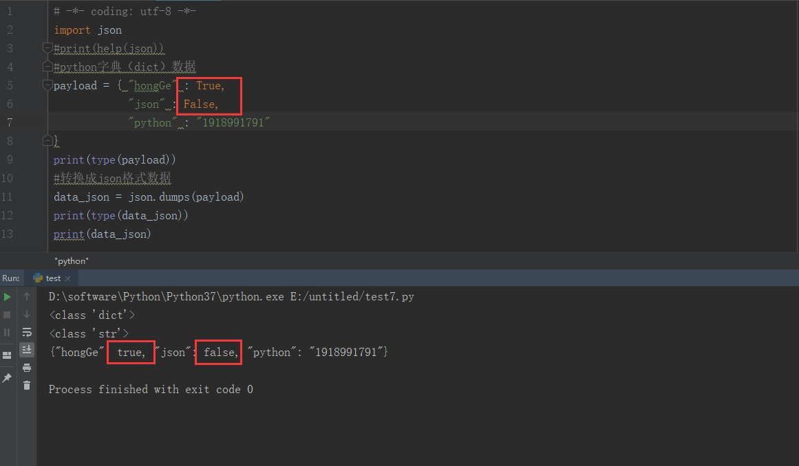 2、举个简单例子,下图的实例中 dict 类型经过 json.dumps()后变成 str,True 变成了 true,False变成了 fasle