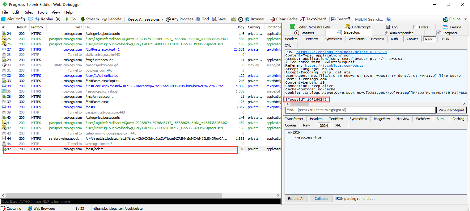 5、用fiddler抓包,抓到删除新建随笔的请求,从抓包结果可以看出,返回结果是一个字符串:{"isSuccess":True},按照上边的步骤用代码实现