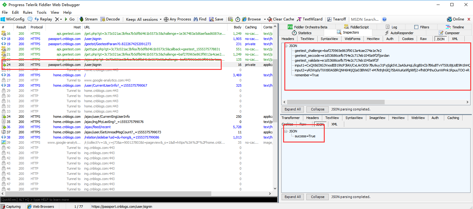 1、以博客园的登录成功结果:{"success":True}为例,我们其实最想知道的是 success 这个字段返回的是 True 还是 False,以便于我们对接口进行断言,以下是fiddler抓包博客园登录成功的结果
