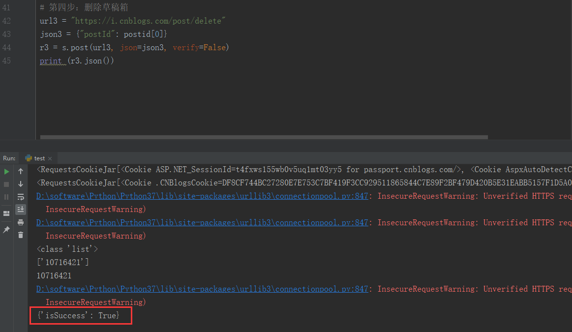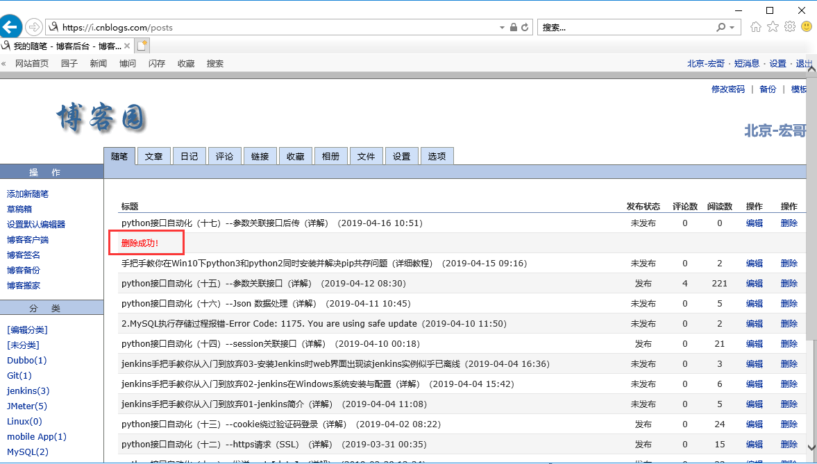 注意:同理和jenkins一样,如果想看清楚,可以在删除新建随笔出打断点,看到新建的随笔后,再次执行下边的代码 看看是不是可以删掉新建随笔